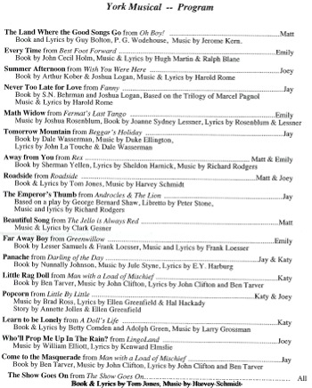 James Morgan, Producing Artistic Director A York Musicale: Songs Old & New Appearing Katy Basile, Emily Clark, Matt Hinkley, Jay Aubrey Jones, Joey Morano Musical Director Brennan Johnson James Morgan served as a terrific host for our afternoon program entitled, "A York Musicale: Songs Old & New" with Brennan Johnson as Musical Director and five singers presenting the material: Katy Basile, Emily Clark, Matt Hinkley, Jay Aubrey Jones & Joey Morano. Some of the songs were from the York's Mainstage Productions. Some from the popular Mufti Series - songs from shows that might not have made it when they were first produced, but deserve to be seen and heard again. Jim also provided us with a written program for us to follow along. We learned what shows the songs came from and, of course, who wrote them. It is always wonderful to learn new songs and hear old ones reinterpreted by such a talented groups of performers. We have had a banner years with remarkable afternoons, but I can safely say that this was one of the best Programs that we've had and many kudos to James Morgan and the York!